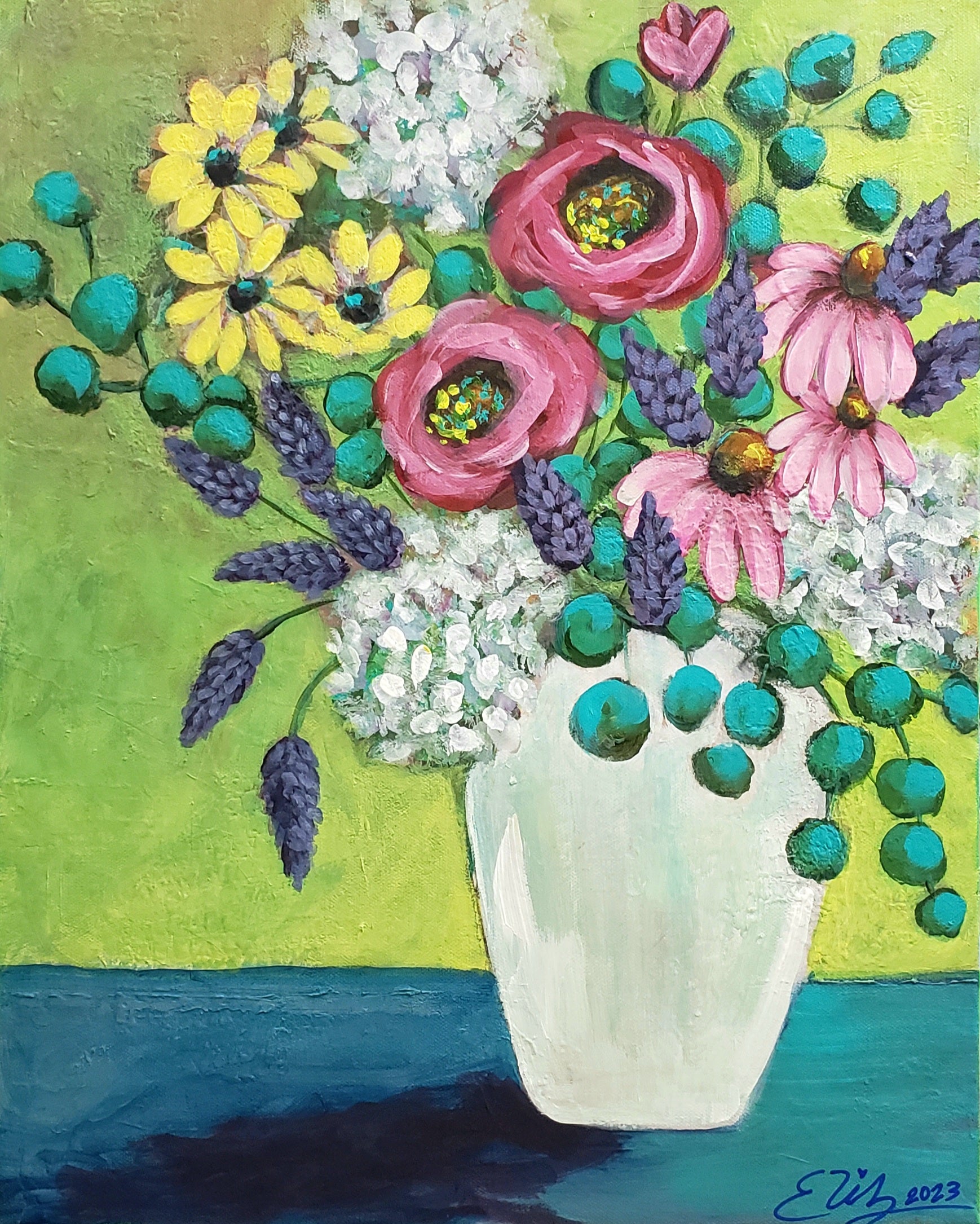 Original floral painting on canvas. A colorful bouquet of fresh picked florals displayed in a white vase. The green and blue background make the vase of flowers pop! I created this mixed media painting using acrylic paint, oil pastels, posca markers and lots of other mediums. This floral painting is sure to create a bit of whimsy and become a focal point in your home. Sides are painted to match background.